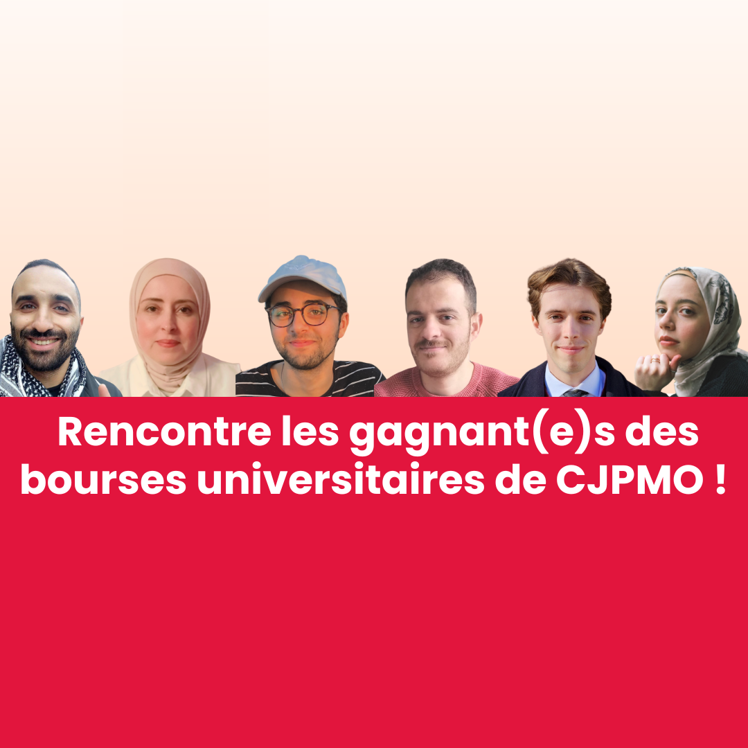 Aujourd'hui, CJPMO est heureux de présenter les six gagnant(e)s et finalistes pour nos bourses académiques 2022-2023 ! Les bourses académiques de CJPMO ont pour but d'encourager les étudiants à poursuivre des études académiques formelles sur la Palestine ou la Solidarité Palestine. Ces bourses font partie de l'initiative Solidarité Campus de CJPMO lancée plus tôt cette année, qui soutient les étudiants par le biais de campagnes, de ressources, de subventions, de bourses et de conseils juridiques.