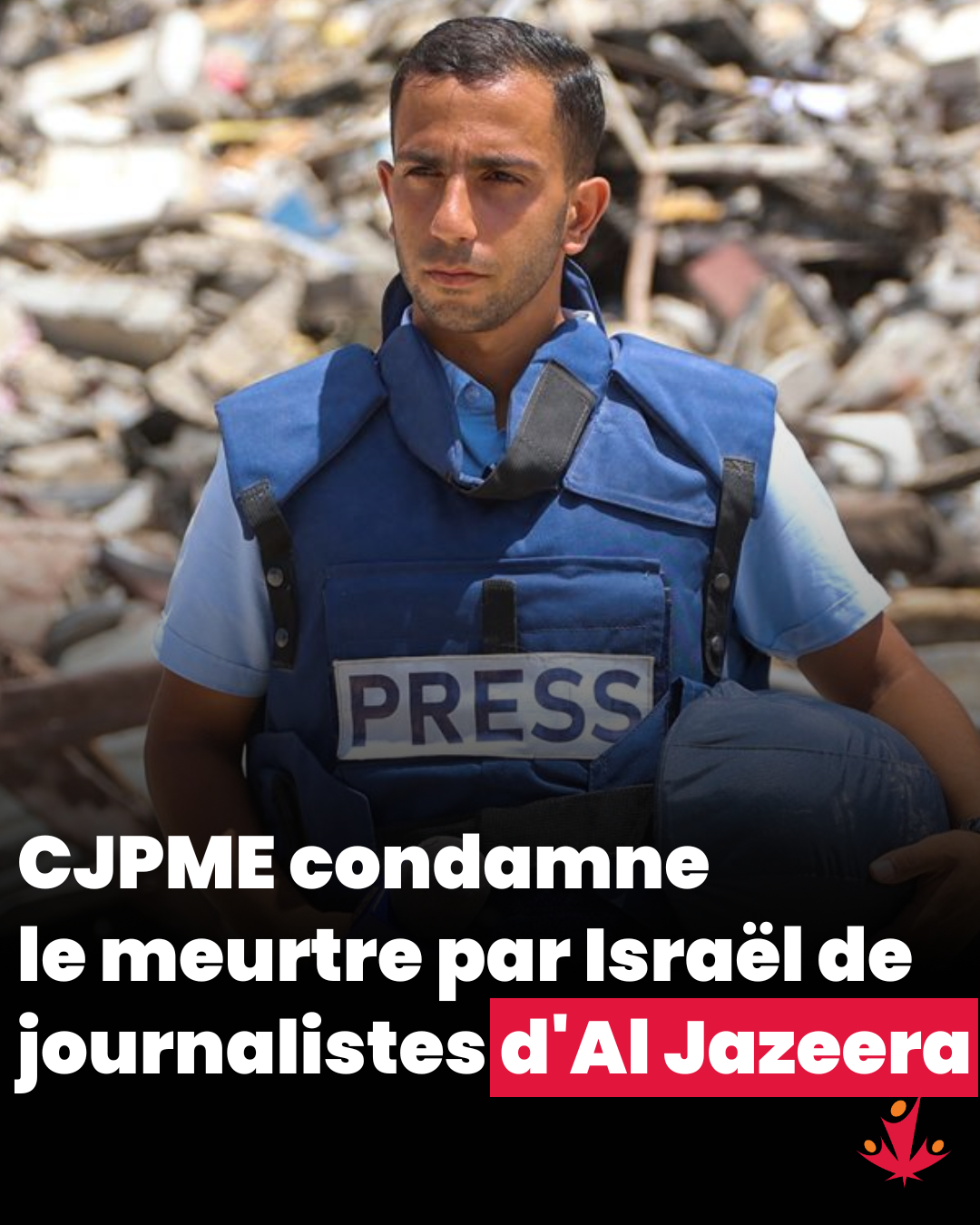« L'assassinat de l'équipe d'Al Jazeera n'est pas un incident isolé, mais fait partie de la campagne israélienne d'extermination des journalistes à Gaza », a déclaré Michael Bueckert, président par intérim de CJPMO. « Israël cherche à éliminer toute voix restante à Gaza qui ose exposer au monde la réalité du génocide. Nous appelons tous les journalistes canadiens à dénoncer ce crime horrible ».